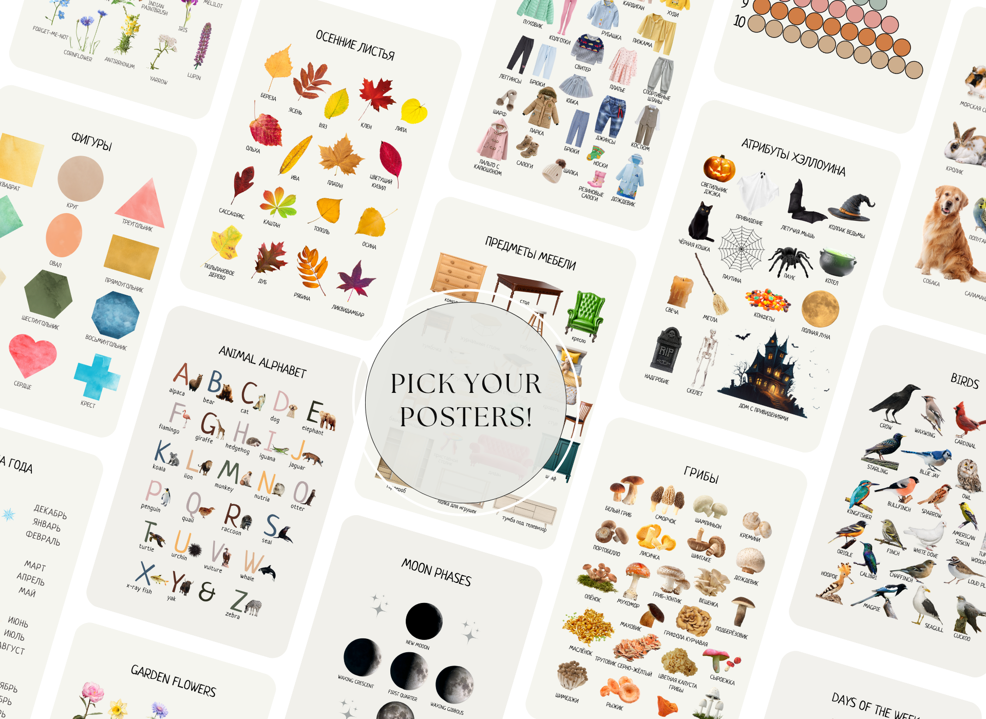 Выберите любимые темы из полной коллекции из 38 обучающих плакатов — каждый из них создан, чтобы пробуждать интерес, расширять кругозор и делать обучение естественным и увлекательным.
